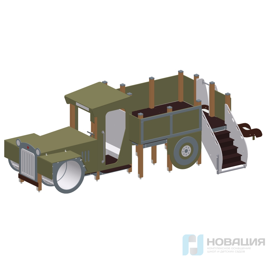 Кабина сопровождается декором: решетка радиатора, колеса, руль. В боковых стенках вырезаны входы, на передней-окно. Лестница и горка пристроены к кузову без крыши. Все участки горки окружены бортами. Скат не ржавеет, на старте предусмотрена перекладина. Лестница включает в себя нескользящие ступени и перила (высокие панели с отверстиями).