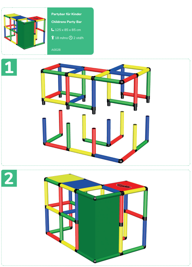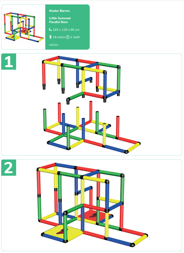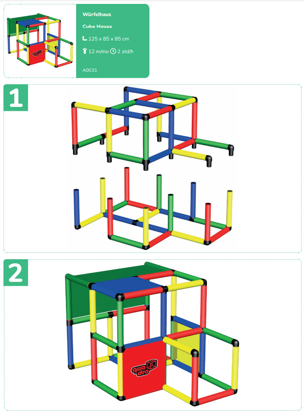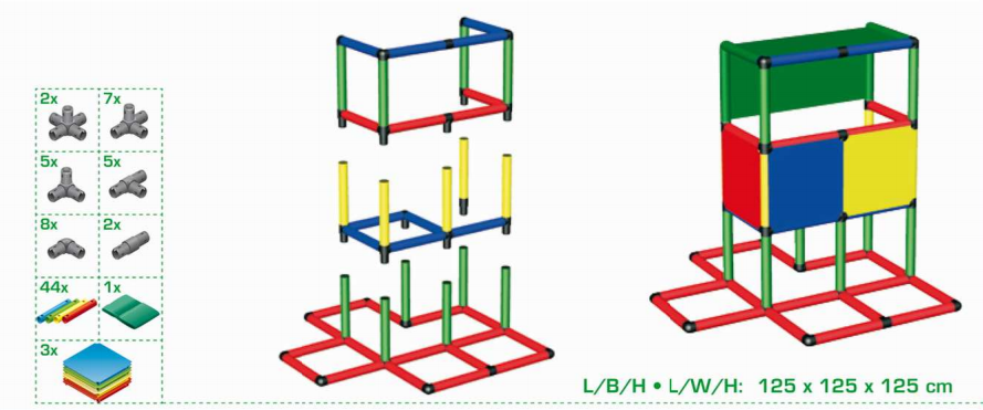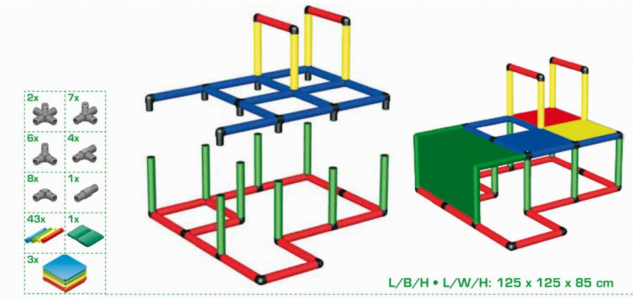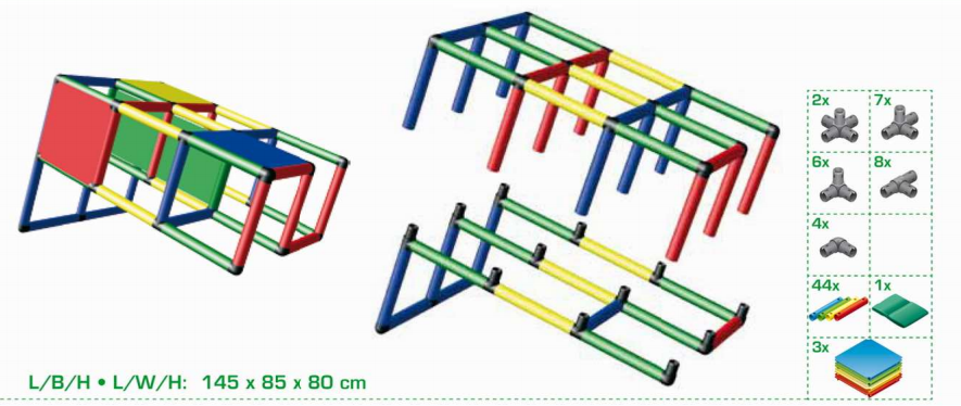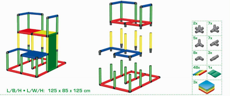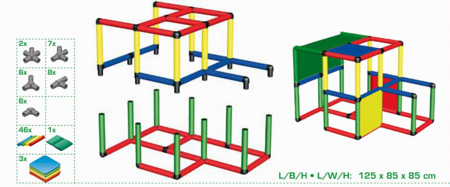 Набор используется при участии взрослых. Из стоек, соединительных муфт и других деталей сооружаются конструкции для лазания. Доступно 14 вариантов строения. К лабиринтам, кубам и домикам добавляются башни и горки. Можно собрать стул, лестницу или пиратский корабль.