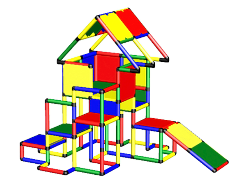 Набор используется под наблюдением взрослых. Соединительные трубки, планки и другие элементы составляются в конструкции. Доступно 6 моделей. Можно собрать двухэтажный домик, беседку с сеткой, манеж с мячиками, замок рыцаря, витую горку.
