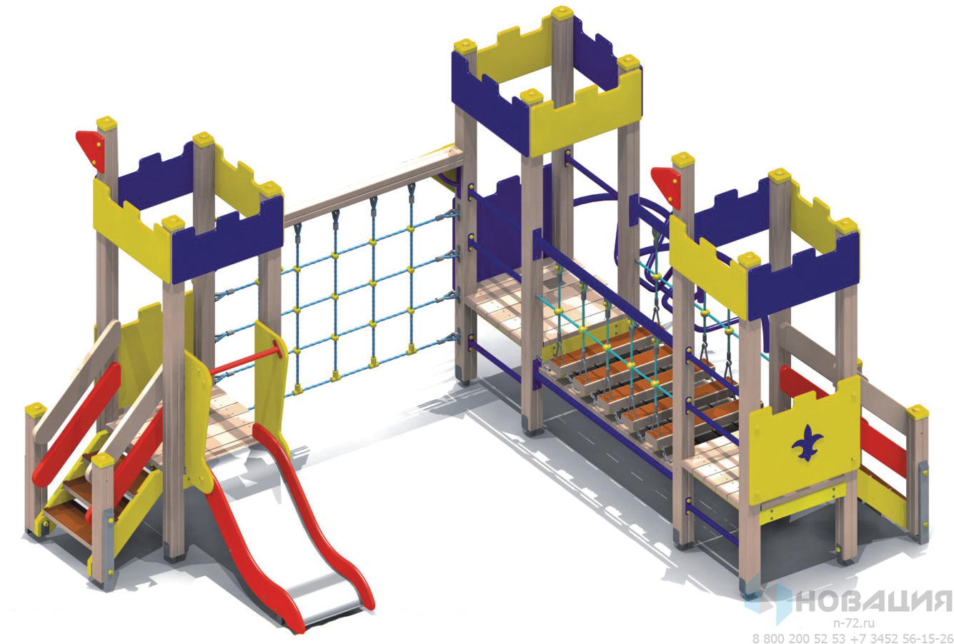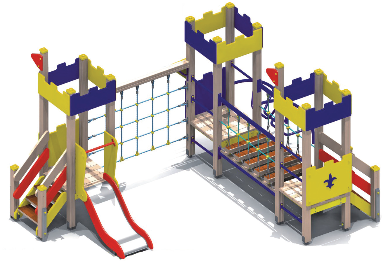 Сборно-разборная конструкция продумана до мелочей: лестница не скользит, все концы труб закрыты, скат горки не ржавеет. Башни украшены резьбой. На столбах фанерные флаги.