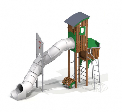 Конструкция с башнями, тоннельной горкой, предупреждающим щитом, сетками из каната займет участок размером 10500х6460 мм. Дополняют комплекс металлическая лиана и деревянный трап. Элементы позволяют проявить гибкость и ловкость. Башни на несущих столбах оснащены ограждениями, стенками с окошками, перекладинами, перилами.
