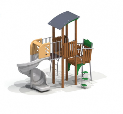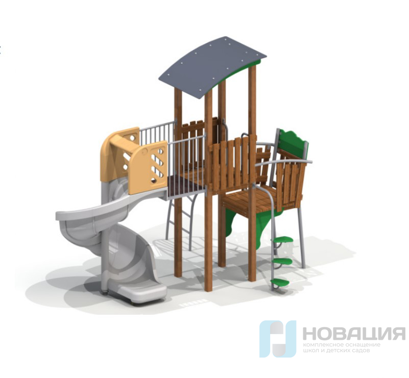 Уличный комплекс размещается в свободном пространстве размером 7480х6530 мм. Полуоткрытая горка в форме спирали, площадки с ограждениями, башня, элементы для лазанья помогают организовать досуг. Деревянные и металлические столбы выполняют роль опор.