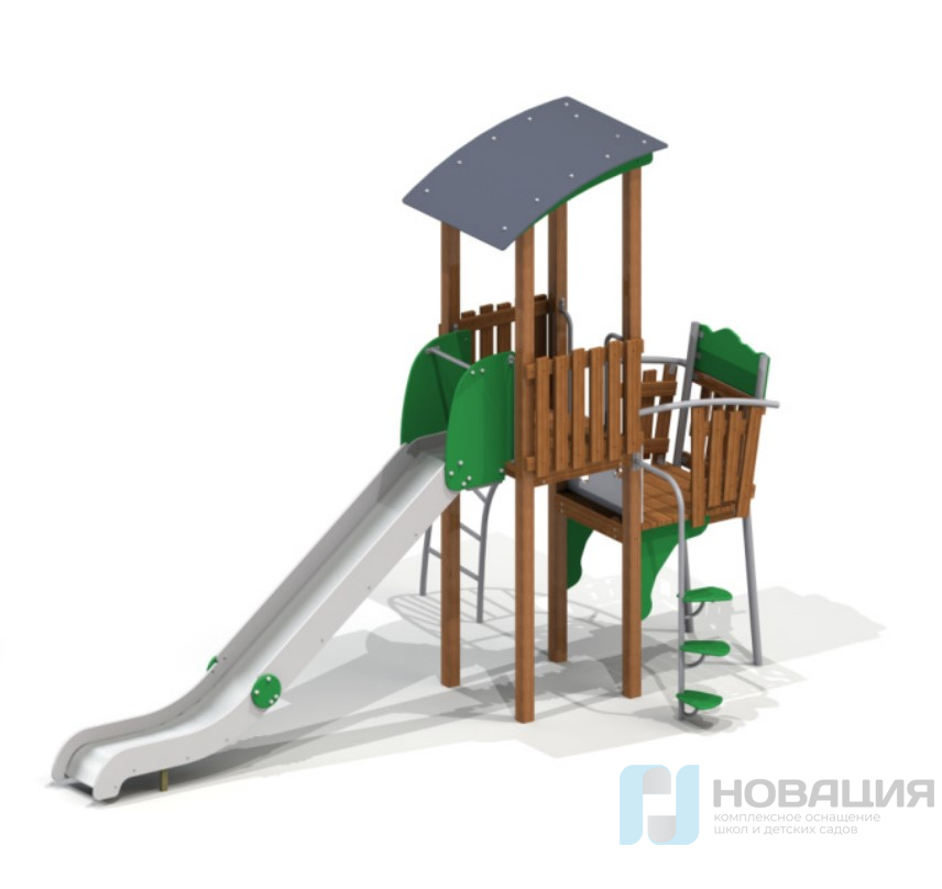 Спорткомплекс занимает площадь размером 9090х6510 мм. Площадка с горкой защищена от осадков крышей. Полы в башнях не скользят. Металлические элементы, включая скат, не ржавеют. Перила и ограждения, модули для подъема довершают облик антивандальной конструкции.