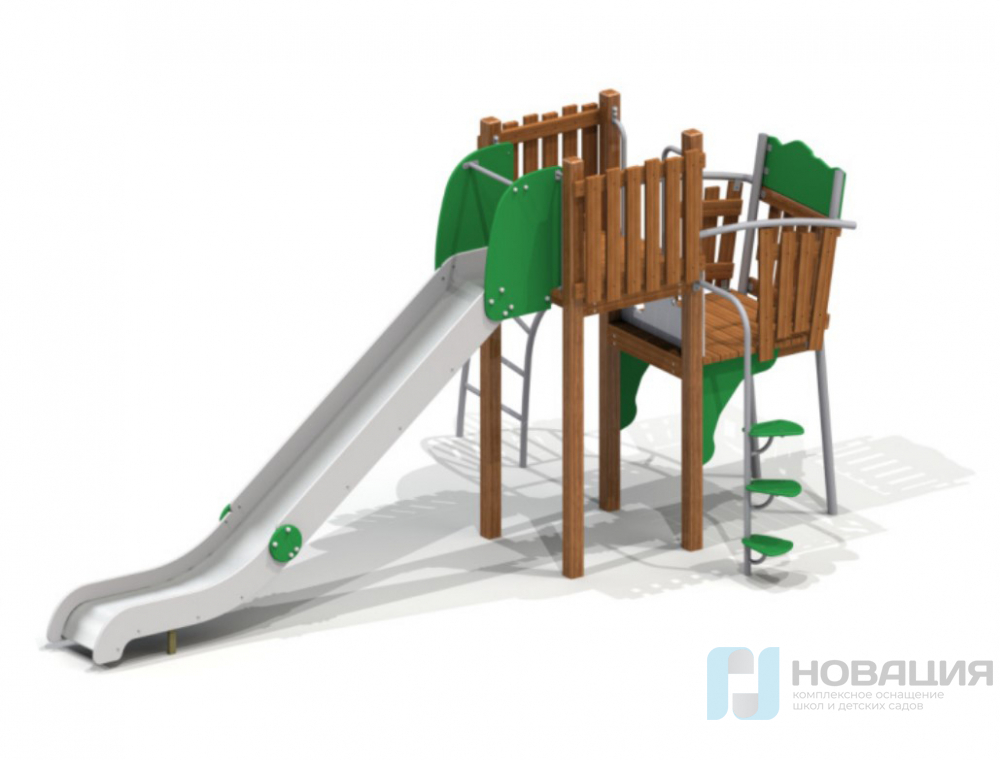 Конструкция с горкой и элементами для лазанья укреплена угловыми элементами. Опирается на столбы из дерева и металла. Площадки окружены заборчиками. Нержавеющий скат дополнен защитной секцией и бортами.