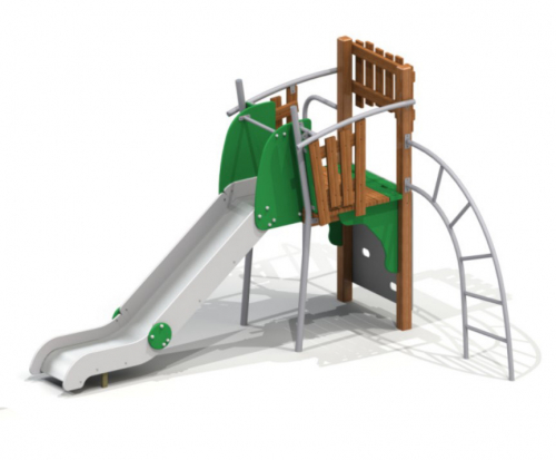 Детская горка с наклонной лианой опирается на деревянные и металлические столбы. Конструкция дополнена ограждениями со входом, защитной секцией, альпинистской стенкой с отверстиями. Лиана выполнена из 2-х труб с перекладинами. Нержавеющий скат оснащен бортами.
