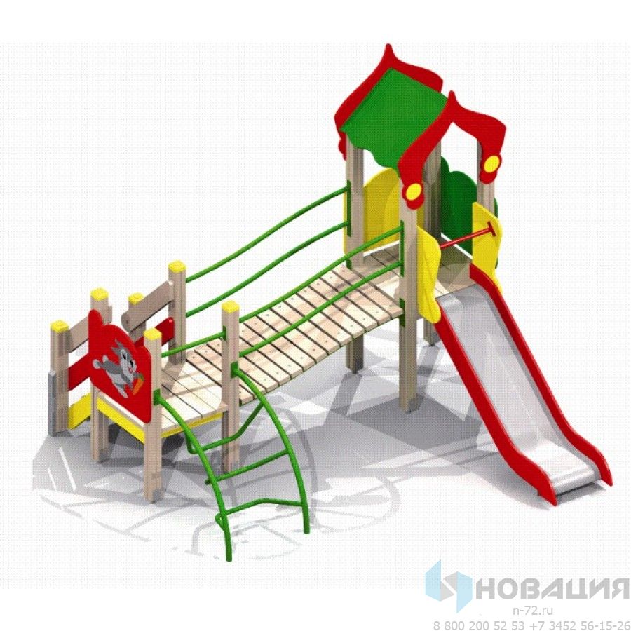 В составе комплекса: лестница, 2 башни, мост, ограждения, наклонная лиана, крыша, горка.