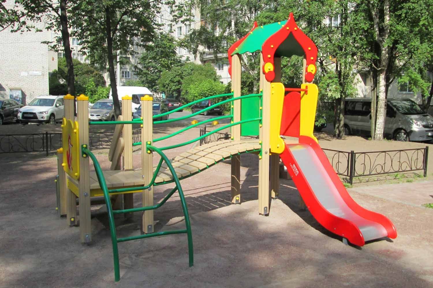Игровой комплекс с волнообразным мостом размещается на территории ДОУ.