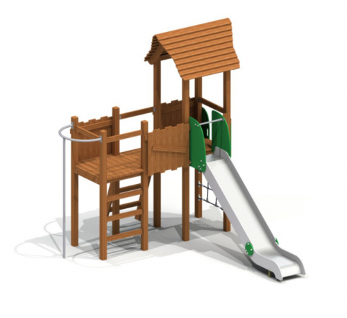 Установка с лестницами, шестом, горкой и сеткой для лазанья частично защищена крышей. Нескользящий пол огорожен. Скат окружен бортами. Стартовый участок оборудован панелями и перекладиной, чтобы ребенок съезжал по нержавеющей поверхности сидя.