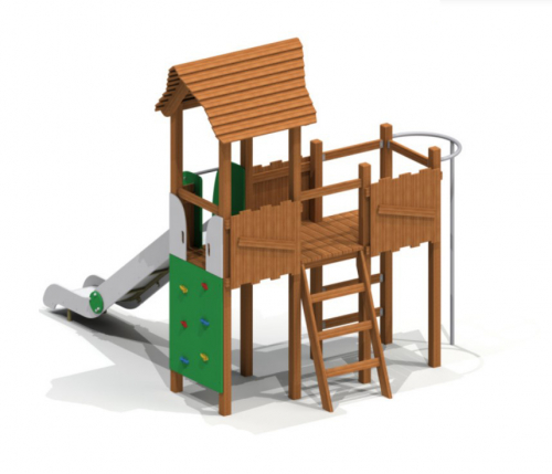 К башне под 2-хскатной фигурной крышей пристроена площадка с ограждениями, горка, лестницы с перекладинами, альпинистская стенка с зацепами, вертикальный шест на дугообразном креплении. Конструкция опирается на несущие столбы. Деревянные элементы сохранят прочность после осадков. Скат горки с бортами и защитной секцией не ржавеет.