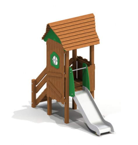 В башне с одним окошком есть лестница и нержавеющая горка, ограждение с зубчатым верхом. Крыша защищает конструкцию от дождя. Корпус опирается на деревянные столбы. Нержавеющий скат окружен бортами. На стартовом участке расположена защитная секция с перекладиной.