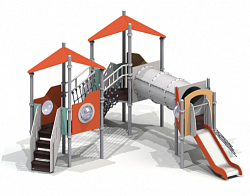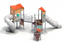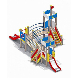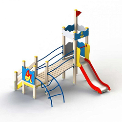 К башне с 2-хскатной крышей пристроены лестница и мост. Вторая башня прикрыта 6-тискатной крышей. Одно из фигурных ограждений дополнено иллюминатором. Внизу закрепляется игровая установка, с других сторон: лестница, горка и начало мостика. Полы и ступени конструкции не скользят. Защитная секция горки окружена аркой.