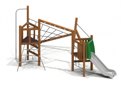Площадки игрового комплекса дополнены деревянными ограждениями, нержавеющей горкой, сетками, перекладинами, шестом. Опорами служат разновысокие столбы. Башни без крыш выполнены из всепогодных материалов. Поверхности не скользят под ногами. Скат с бортиками оснащен защитной секцией на участке старта.