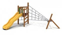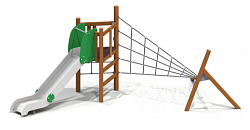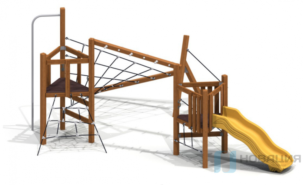 Площадки с ограждениями, сетками, перекладинами, шестом, пластиковой горкой опираются на разновысокие столбы. Полы не скользят. Волнообразный скат дополнен бортами. Перед стартом предусмотрена защитная секция.