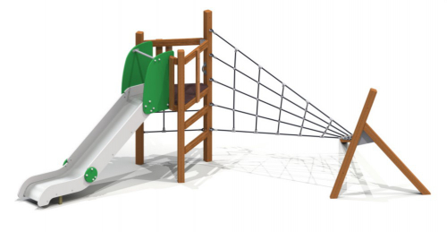В комплексе для физического развития есть перекладины, горка, сетка для лазанья. Разновысокие несущие столбы (наклонные и вертикальные) дополнены креплениями для канатов. Площадка без крыши огорожена. Перед нержавеющим скатом с бортиками установлена защитная секция.