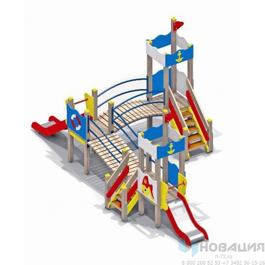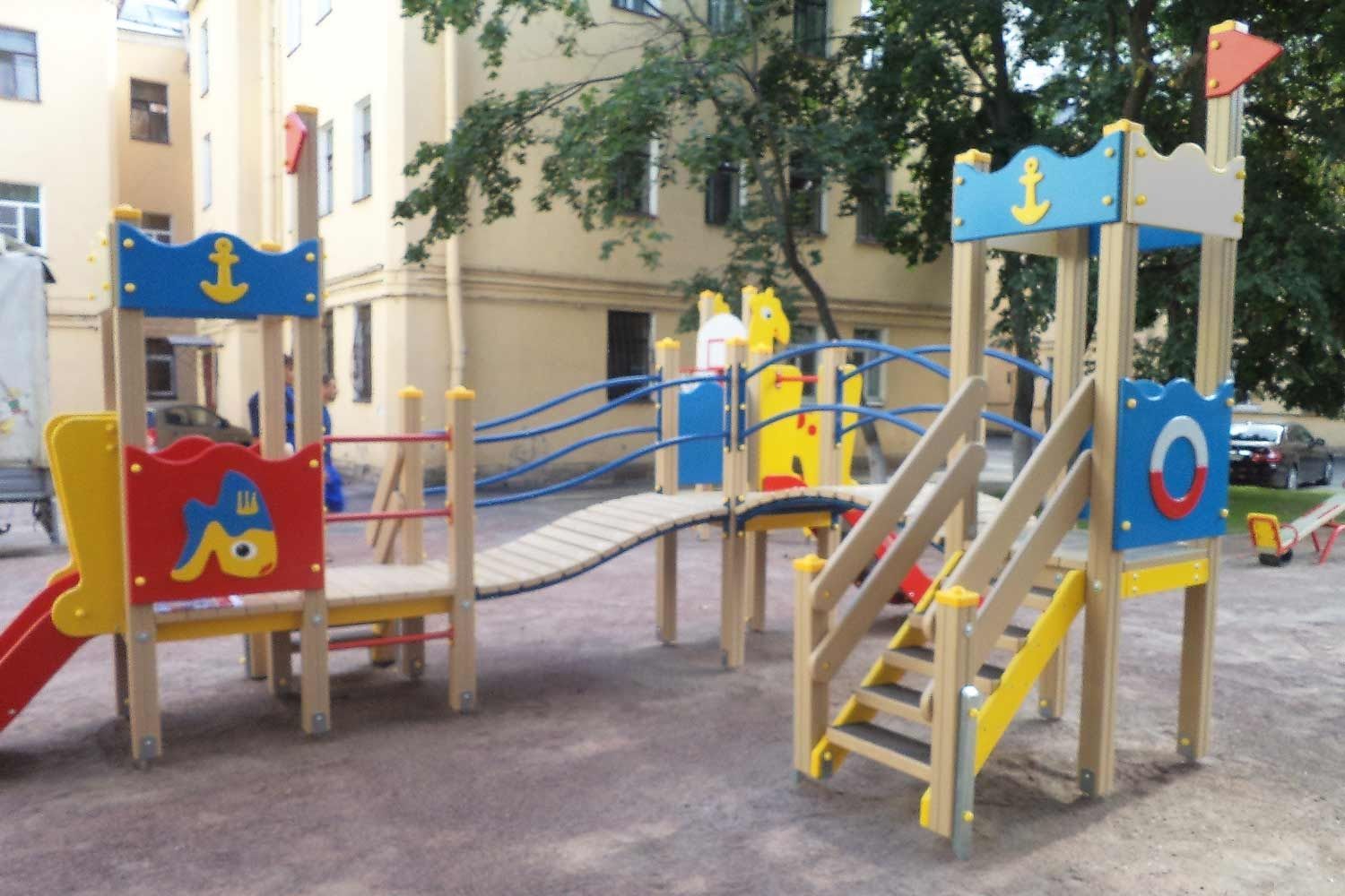 - Тип конструкции сборно-разборный. Модули украшены изображениями якоря, золотой рыбки, спасательного круга. На столбах декоративные флаги. Верхние стороны цветных панелей волнообразные.