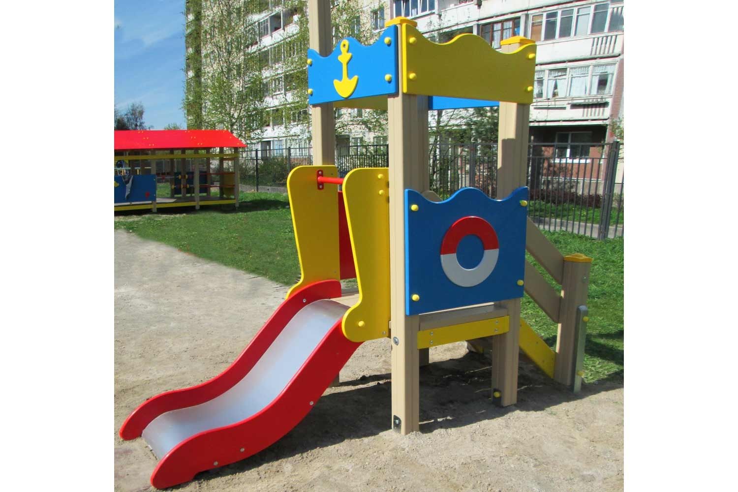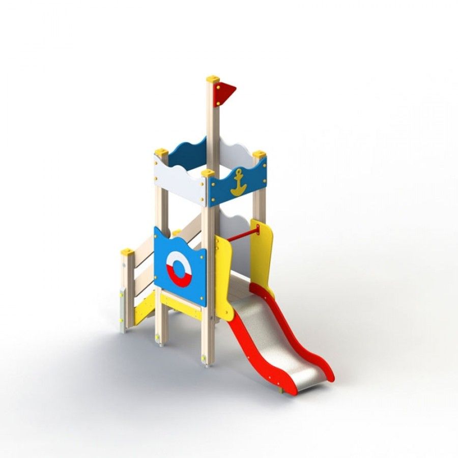 Оборудование сборно-разборное. Украшено изображением якоря, спасательного круга. На столбе декоративный флаг. Верхние стороны крыши и ограждения волнообразные. Нержавеющий скат дополнен защитной секцией с перекладиной, d 33 мм, окружен бортиками, h 100 мм.