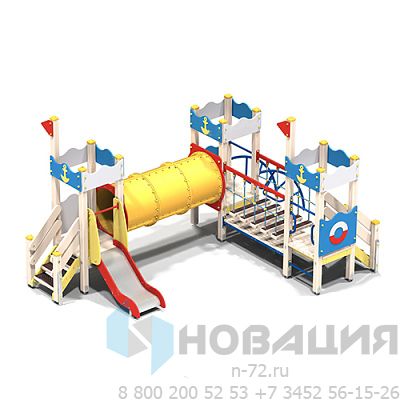 Комплекс оформлен с помощью резьбы, декоративных флагов, росписи, накладных якорей и спасательных кругов.
