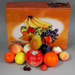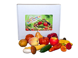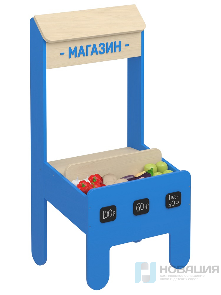 Конструкция в виде магазинной витрины представлена комбинацией элементов: 4 устойчивые ножки, витрина с 3 отсеками, ценниками и комплектом овощей (46 шт.).