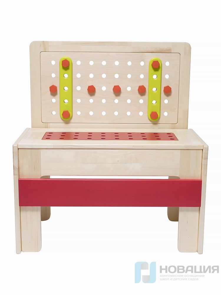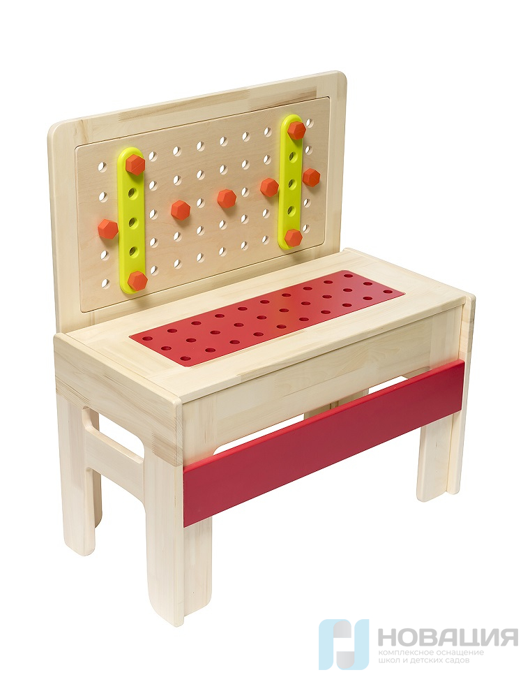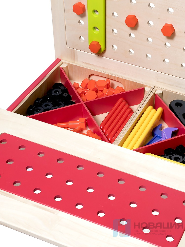 - стенкой с отверстиями для саморезов, при помощи которых крепятся разноцветные фигурки и столярные инструменты,