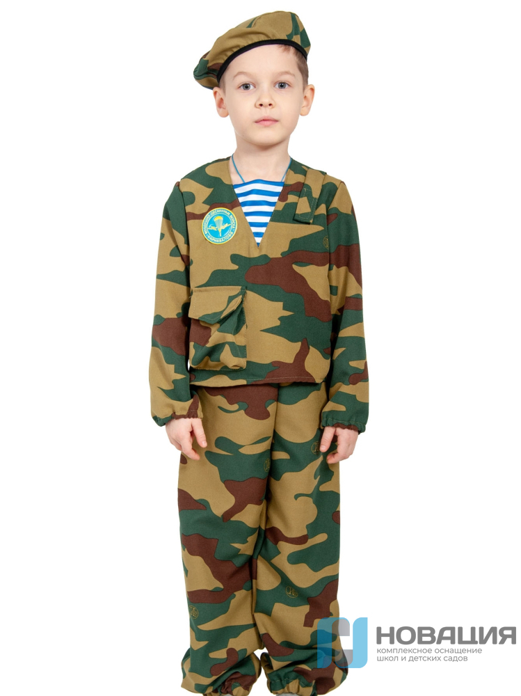 Костюм десантника для мальчика состоит из куртки, брюк и берета в камуфляжной расцветке. Подходит для постановки сценок и спектаклей, посвященных 9 мая и 23 февраля.