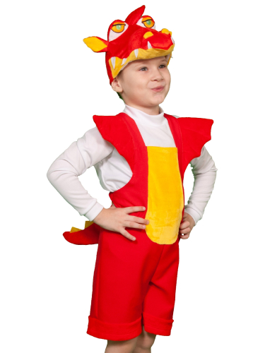 Карнавальный костюм для мальчика состоит из полукомбинезона с хвостом сзади и головного убора в виде головы дракона. Бретели полукомбинезона регулируются. Выполнен из плюшевой ткани. Может использоваться для проведения спектаклей, сценок и костюмированных представлений.