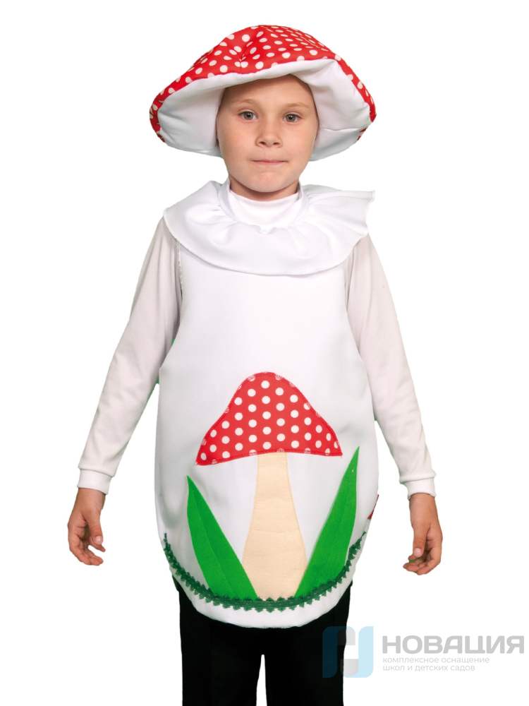Костюм состоит из фартука и шапочки в виде шляпки мухомора. Подходит для мальчиков и девочек. Может использоваться для проведения спектаклей, сценок и костюмированных представлений.