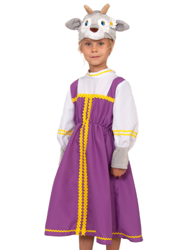 Детский костюм предназначен для девочек. Состоит из платья с имитацией сарафана и шапочки в виде головы козы. Может использоваться для постановки спектаклей, сценок и костюмированных представлений.