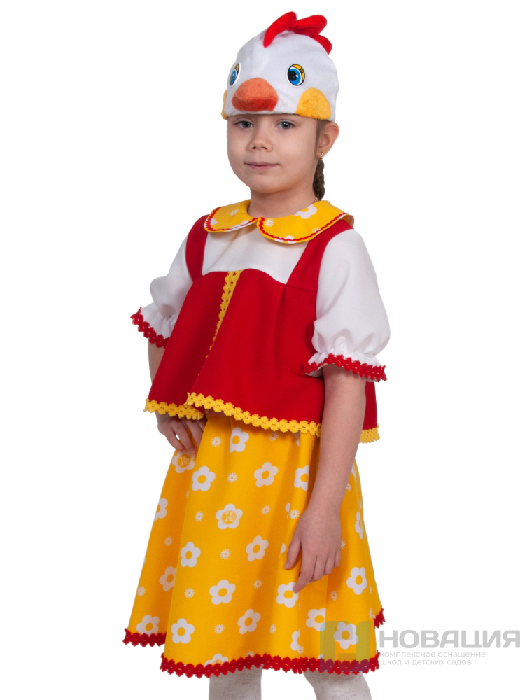 Костюм предназначен для девочек. Состоит из блузки, юбки и шапочки-маски в виде головы курочки. Подходит для постановки спектаклей и сказок, проведения утренников.