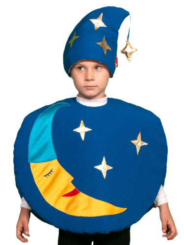 Детский карнавальный костюм состоит из шапочки и фартука, украшенных изображениями месяца и звезд. Подходит для мальчика и девочки. Может использоваться для проведения спектаклей, сценок и костюмированных представлений.