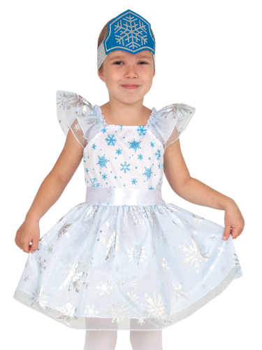 Костюм для девочки украшен серебристыми и голубыми снежинками. Предназначен для проведения новогодних спектаклей, сценок и мероприятий.