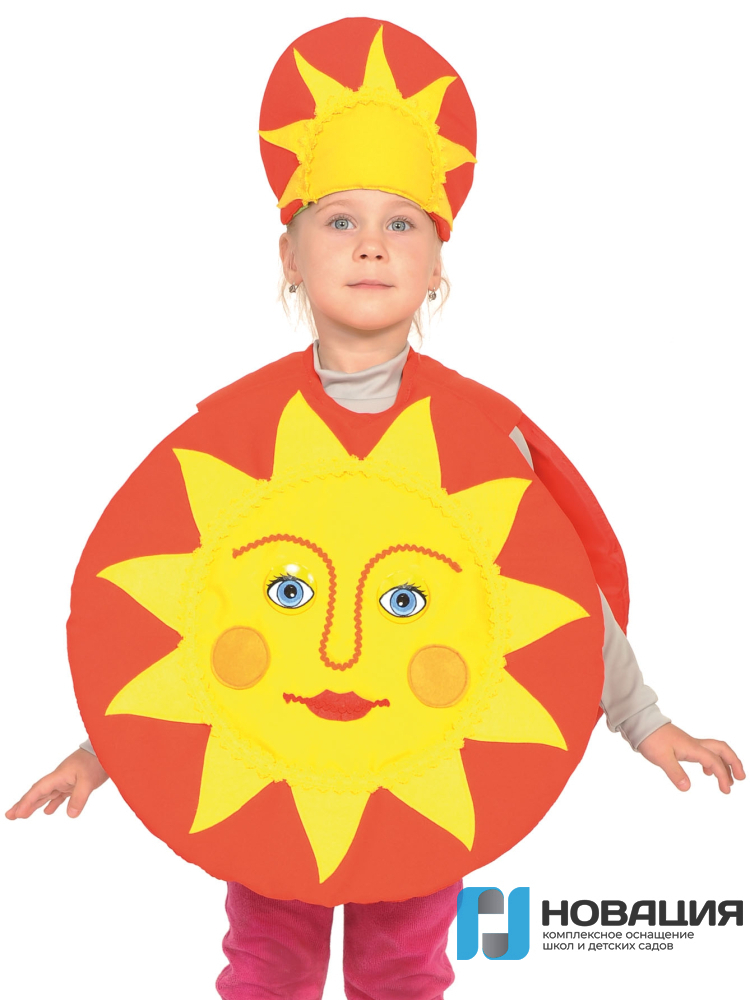 Карнавальный костюм для девочки состоит из фартука и шапочки с изображением солнышка. Может использоваться для проведения спектаклей, сценок и костюмированных представлений.