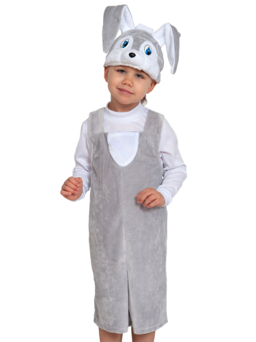Карнавальный костюм для мальчика состоит из полукомбинезона с небольшим хвостом сзади и головного убора в виде головы зайца с ушками. Бретели полукомбинезона регулируются. Выполнен из плюшевой ткани. Может использоваться для проведения спектаклей, сценок и костюмированных представлений.