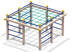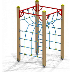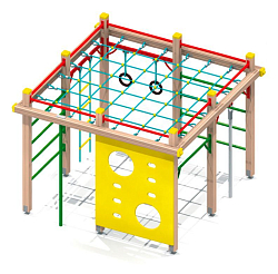 Опорные столбы и бум-бревна формируются из деревянного бруса. Наклонная лиана, вертикальный шест, рукоход и перекладины металлические. Настил гимнастической скамьи, переход-переправа, ступени подвесного мостика и альпинистская стенка фанерные. Пол в башне изготавливается из деревянной доски.