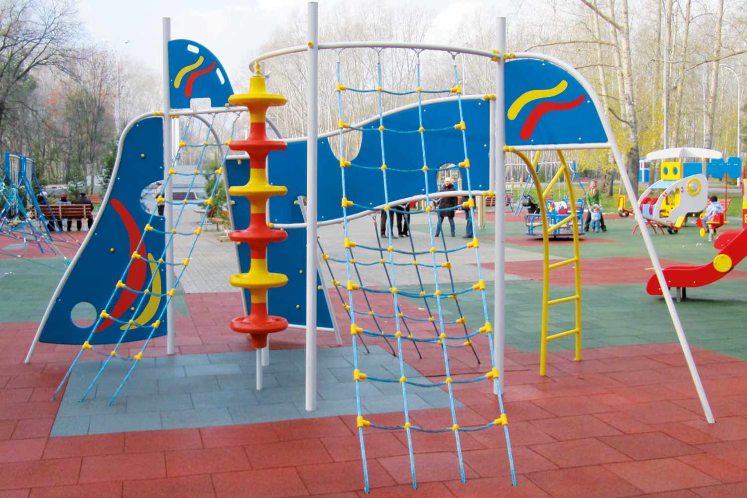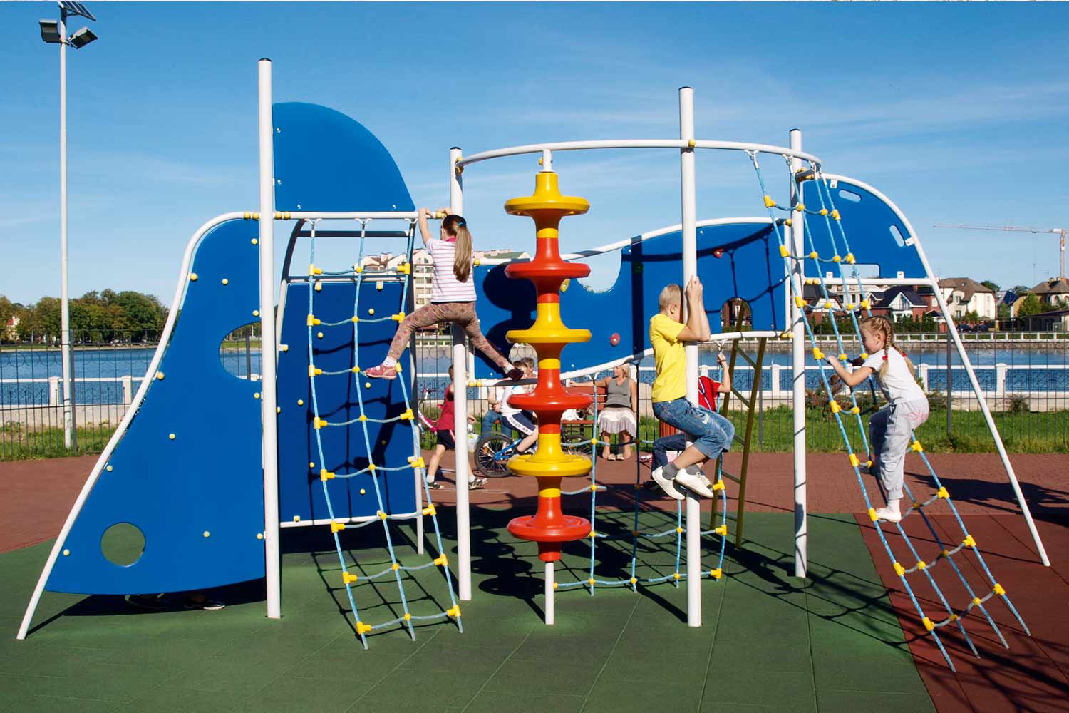 В составе комплекса: 4 столба, 3 альпинистские стенки с зацепами, 3 полипропиленовые сетки для лазания, дугообразная лестница, вертикальный шест с колесами.