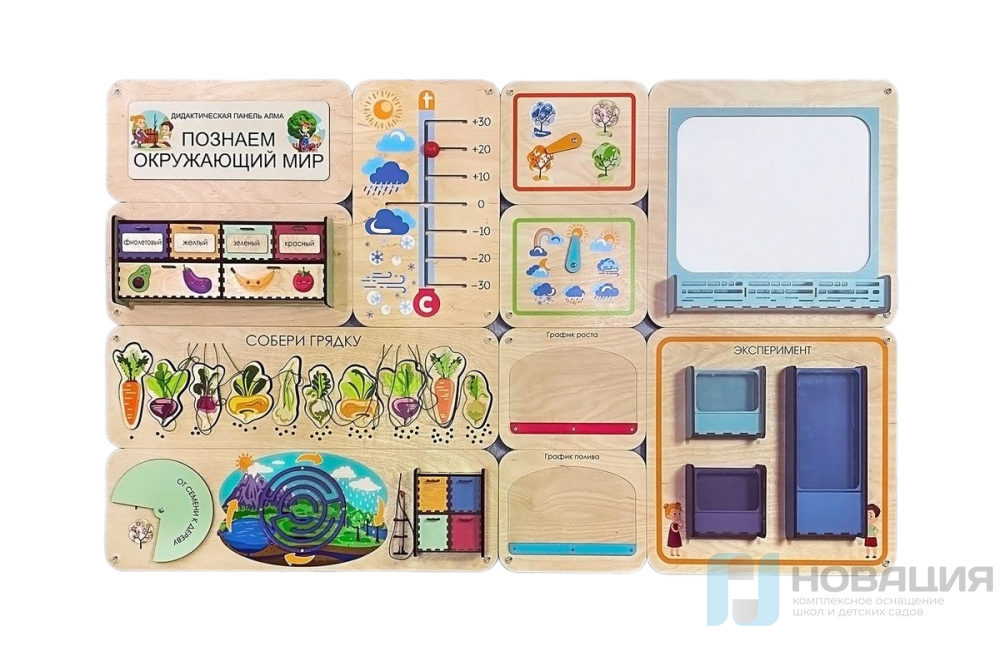 Панель прочно закрепляется на стене. Все материалы безопасны для детей и сертифицированы.