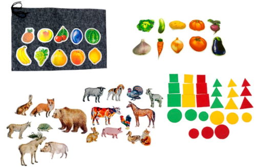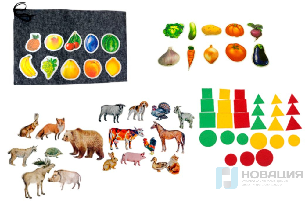 Фланелеграф для детского сада представляет собой игровое поле из ковролина, к которому крепятся плоские фигурки с тематическими изображениями.