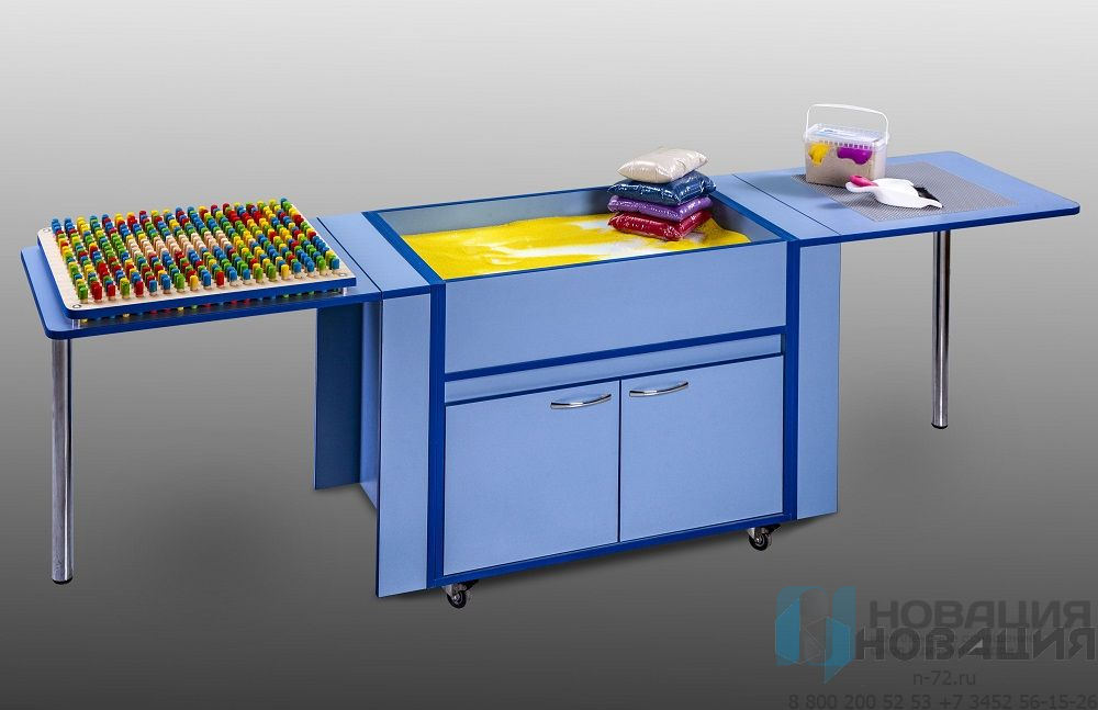 Стол-парта оснащается подсветкой и дополнительными отсеками. Такая мебель позволяет рисовать песком, заниматься лепкой, собирать мозаику. Материалы поставляются вместе с оборудованием и хранятся внутри. RGB-подсветка управляется при помощи пульта.
