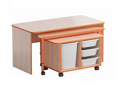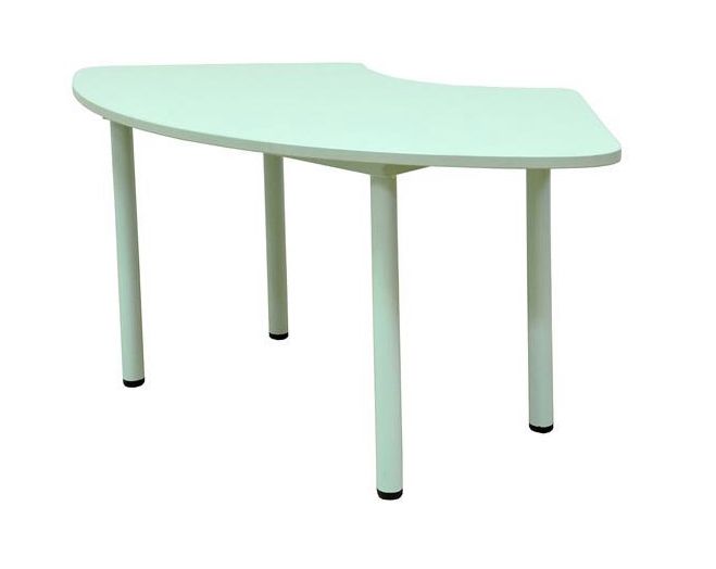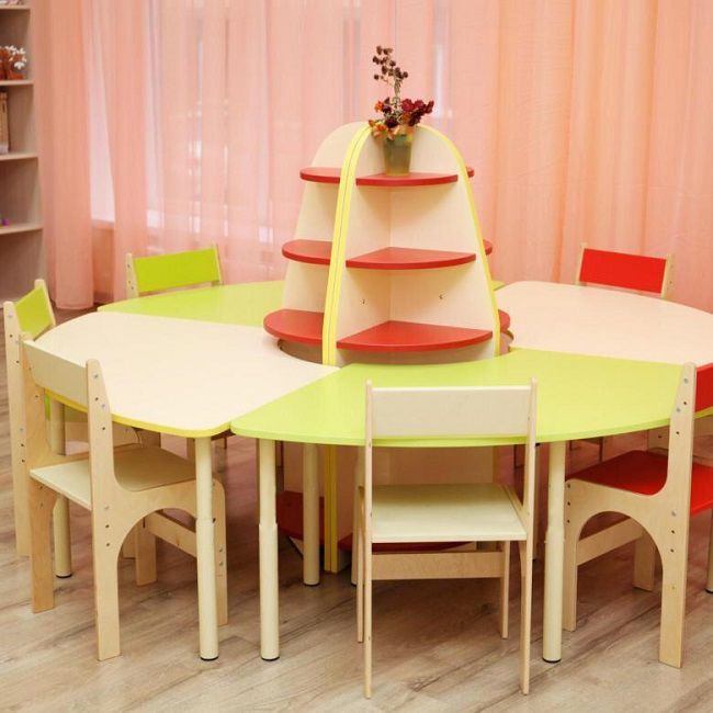 Стойки выполнены из ЛДСП, кромки щитовых элементов обрамлены кромочным пластиком толщиной 2 мм. Конструкция дидактического стола состоит из металлического каркаса из стальных труб и радиусной столешницей из ЛДСП.