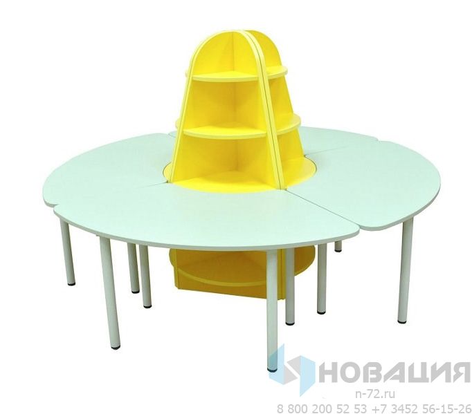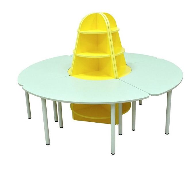 Комплект состоит из четырёх угловых стоек и четырёх дидактических столов, которые образуют круговую композицию. Стойки соединяются между собой при помощи межсекционных стяжек.