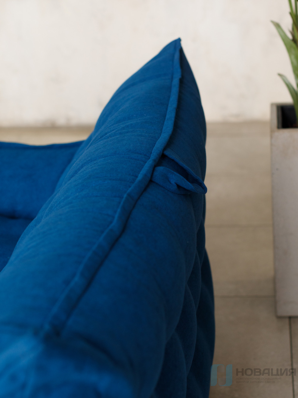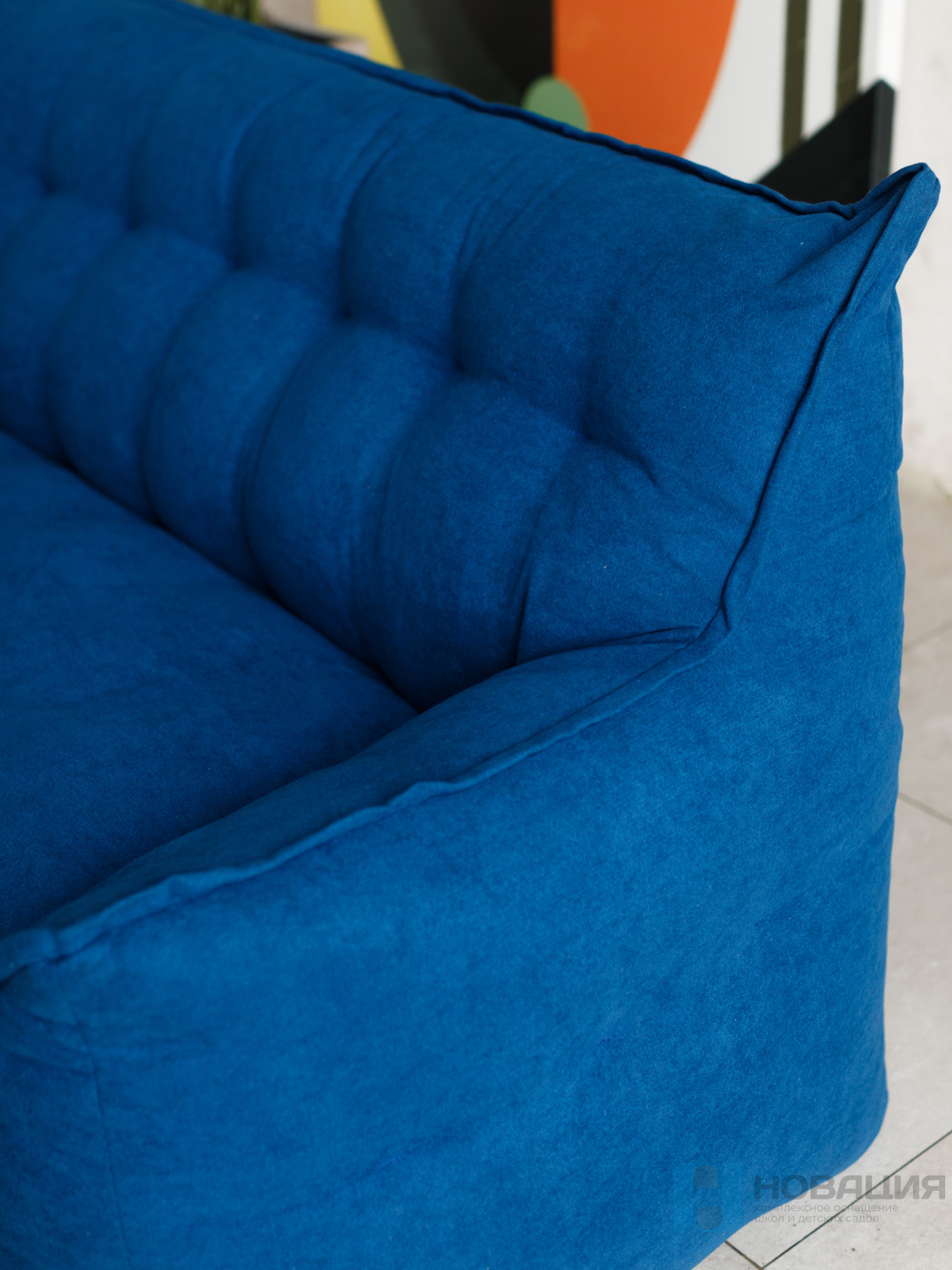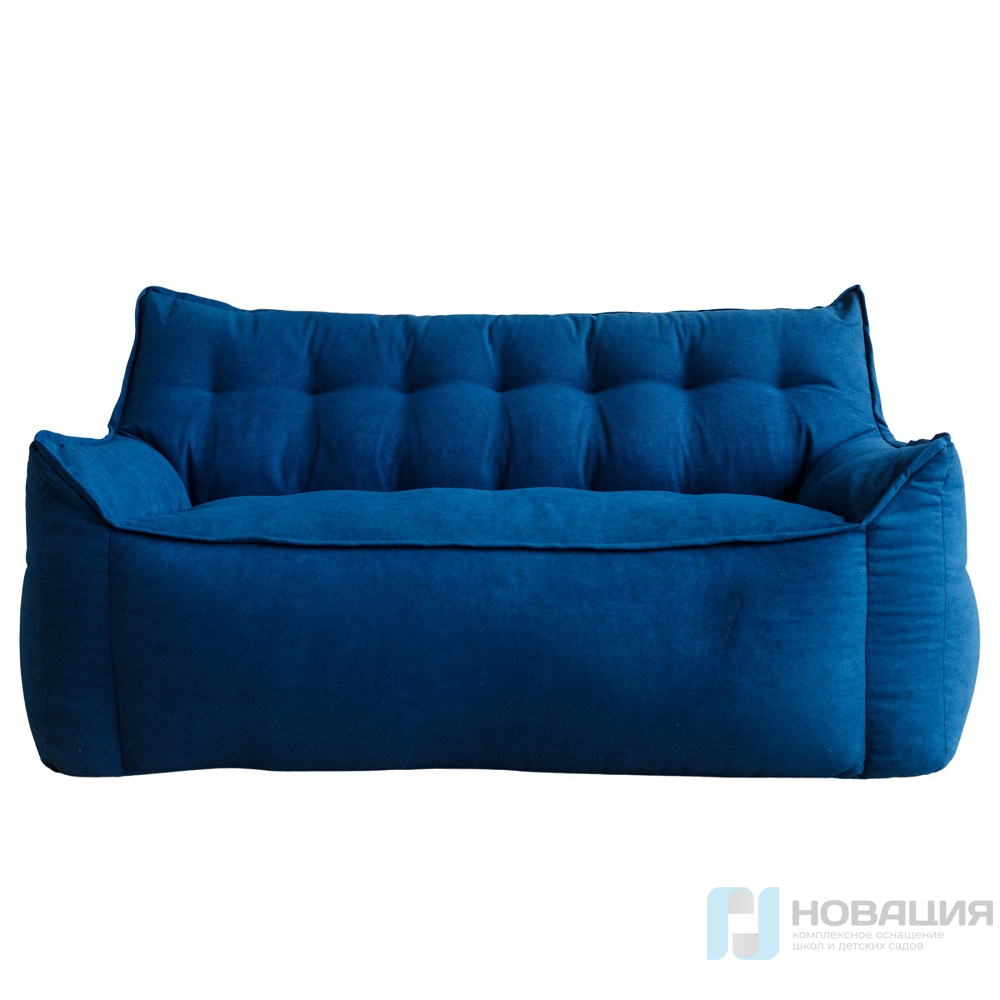 Бескаркасный диван равномерно заполнен гранулами. Обивка легко очищается от загрязнений при помощи влажной губки. Чехол не снимается. Предусмотрен клапан для досыпки наполнителя. С обеих сторон есть подлокотники, которые располагаются на высоте 15 см от сиденья.