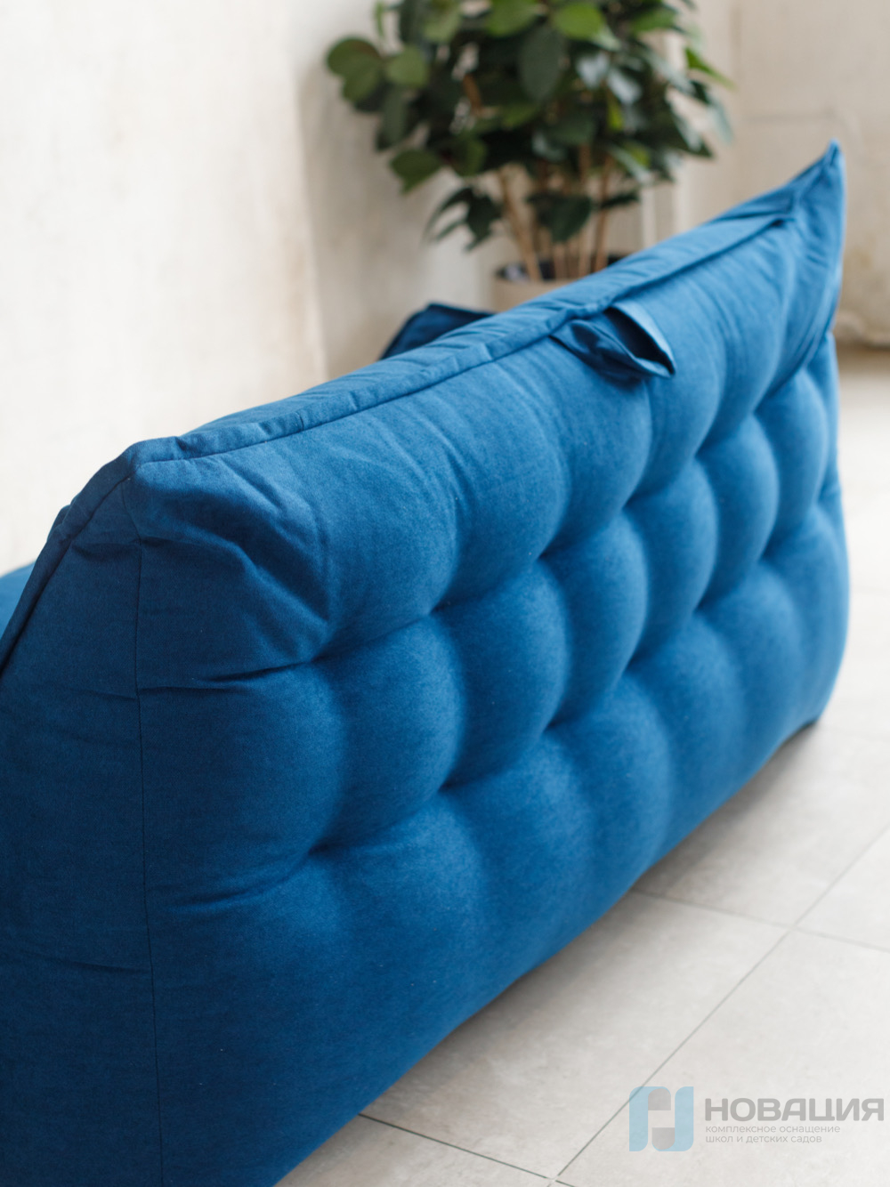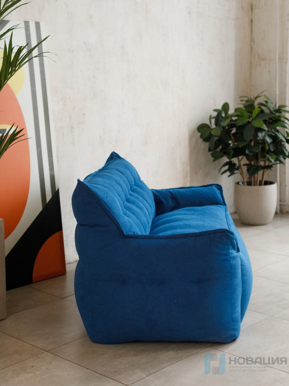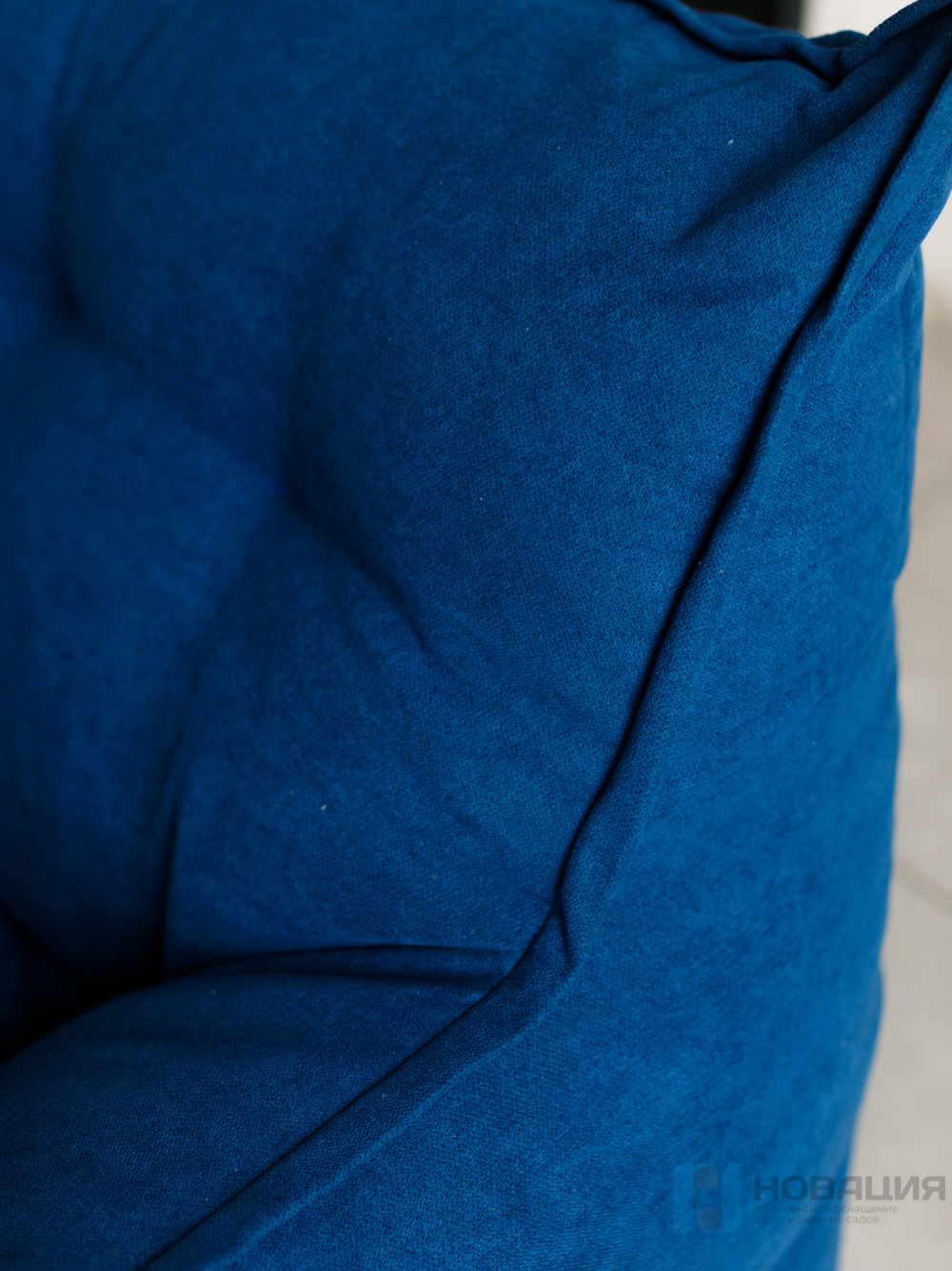 Бескаркасный диван равномерно заполнен гранулами. Обивка легко очищается от загрязнений при помощи влажной губки. Чехол не снимается. Предусмотрен клапан для досыпки наполнителя. С обеих сторон есть подлокотники, которые располагаются на высоте 15 см от сиденья.