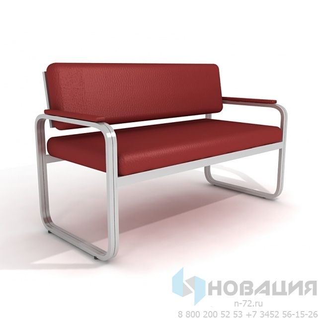 Диван подходит для медицинского кабинета или зоны ожидания. Изделие стоит на боковых опорах из труб прямоугольного сечения, парно соединенных с подлокотниками и укрепленных перекладиной. Мягкие прямоугольные элементы сиденья и спинки разделены. Опоры скамейки дополняются подпятниками. На подлокотниках предусматриваются фрагменты с обивкой.