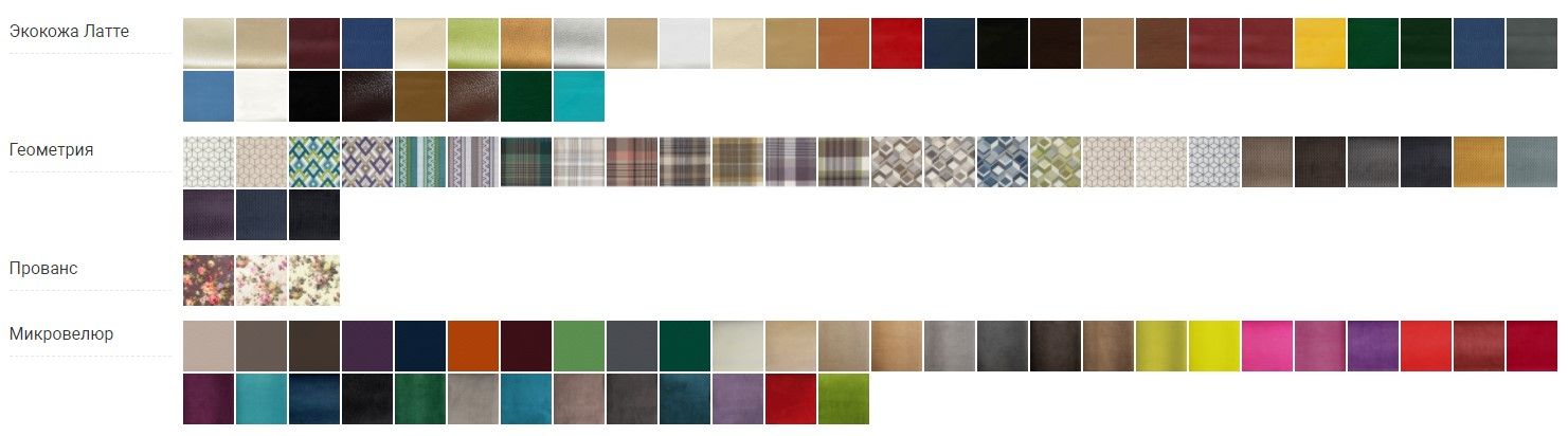 Базовый материал обивки: кожзаменитель/ ткань вельвет. Возможно исполнение с обивкой из экокожи, микровелюра, ткани с геометрическими рисунками, ткань прованс (стоимость в таком случае изменится).