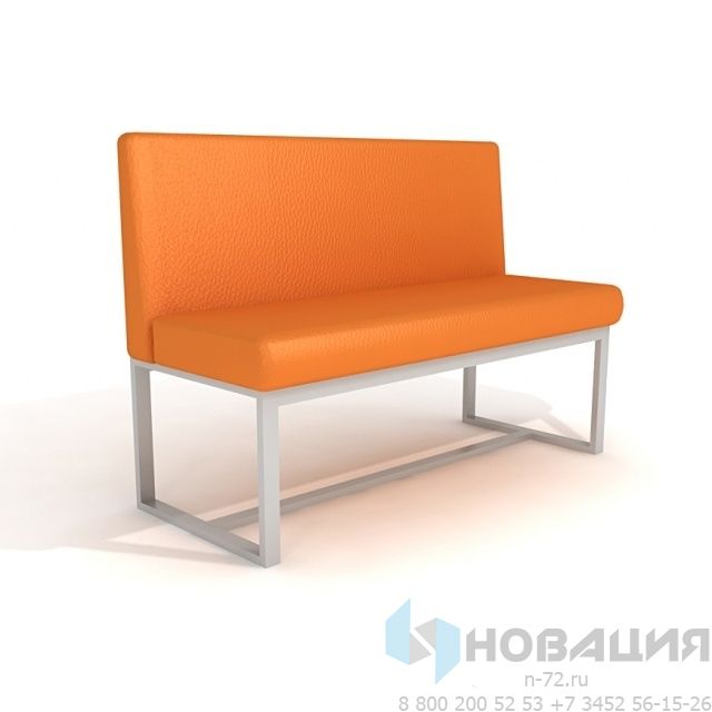 Диван для медицинского кабинета или зоны ожидания стоит на боковых опорах, которые соединяются в прямоугольники. Нижние трубы укрепляются поперечной перекладиной. Мягкие прямоугольные элементы сиденья и спинки фиксируются на каркасе без подлокотников.