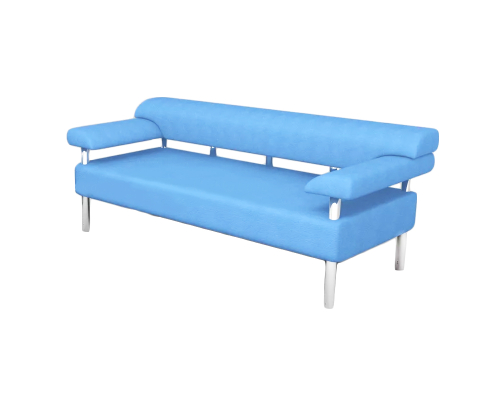 Трехместный диван оснащен подлокотниками и эргономичной спинкой. Размещается на 4-х круглых металлических опорах. Материал обивки подходит для влажной уборки.