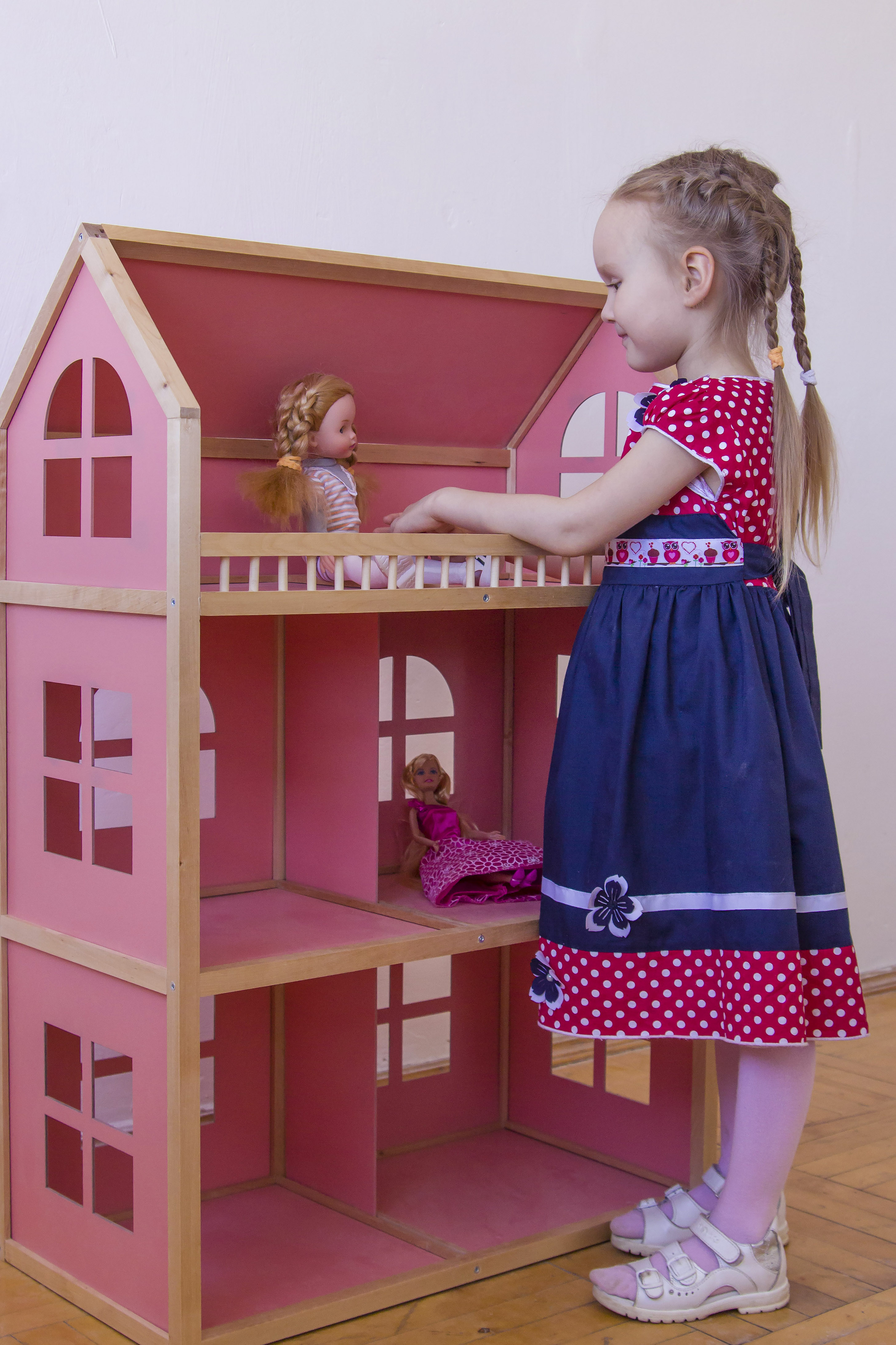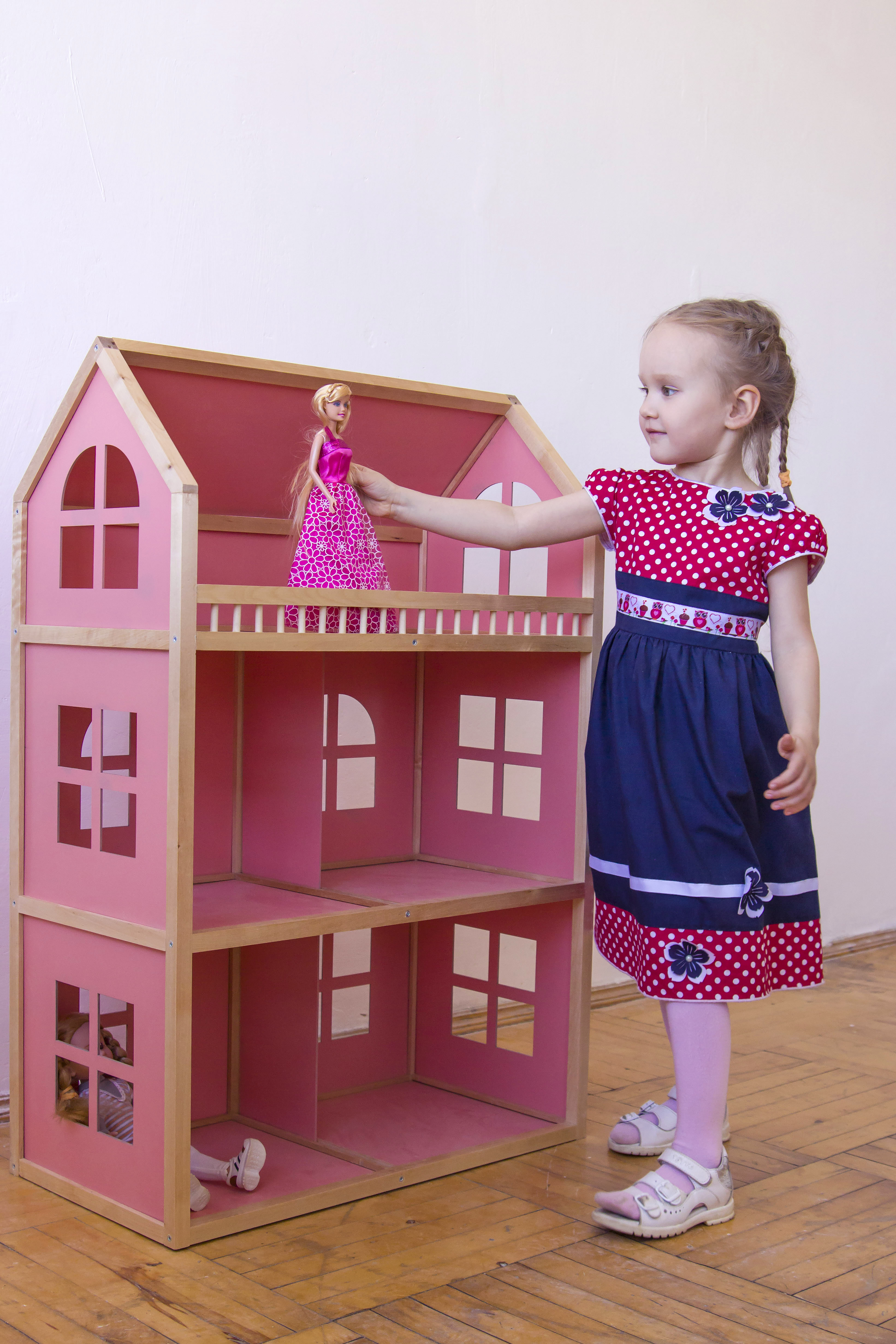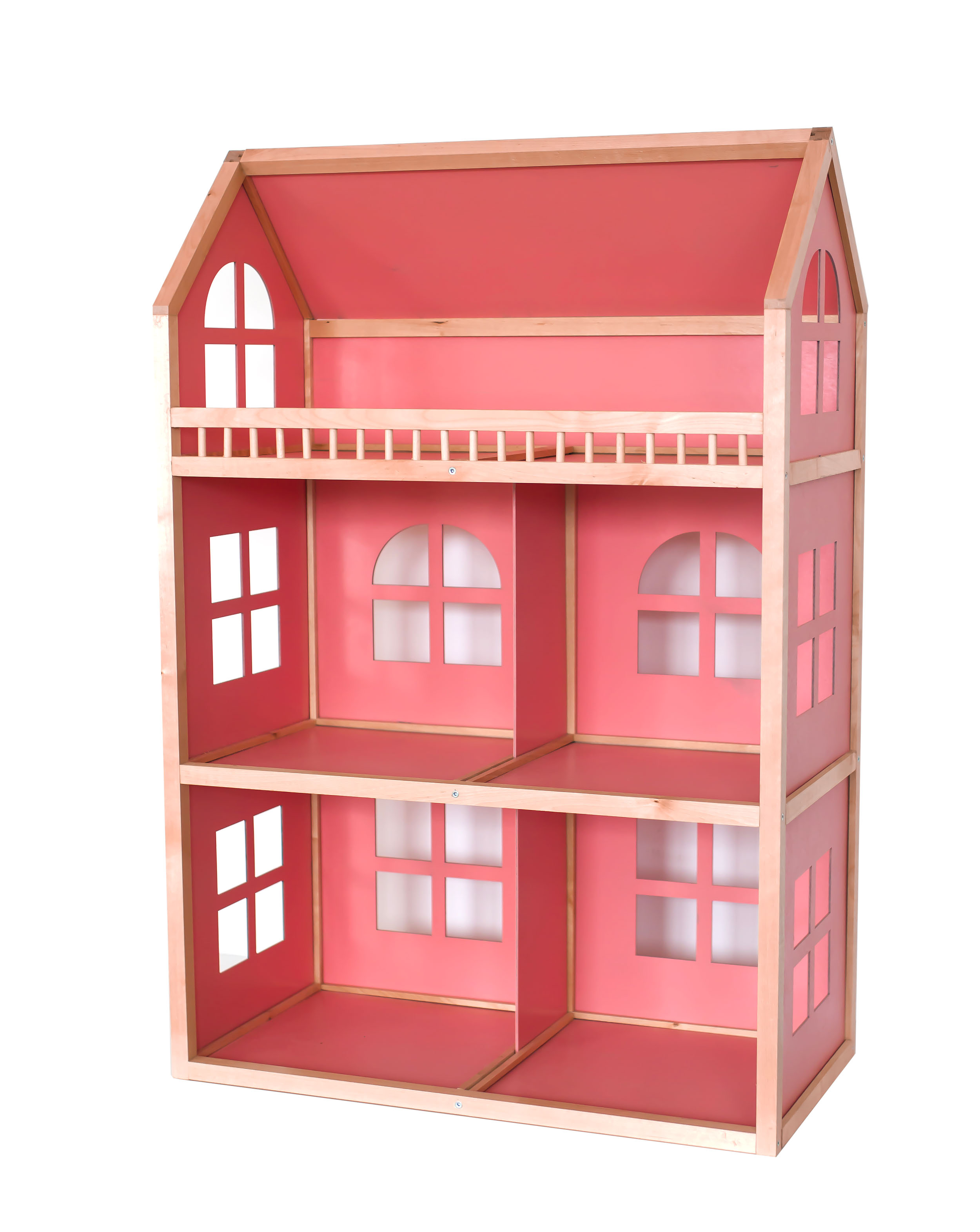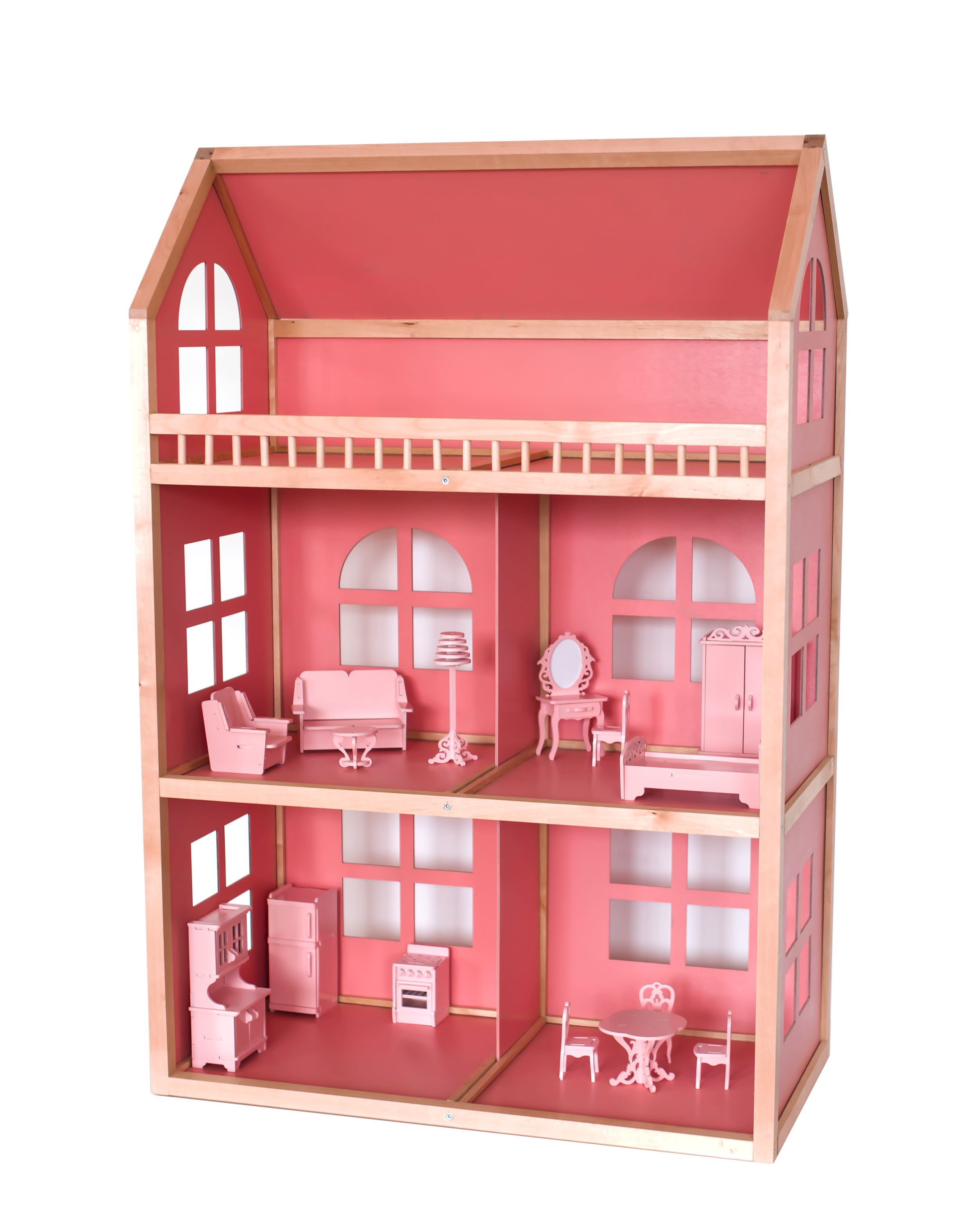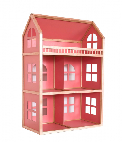 Трехэтажный домик изготовлен в розовых тонах. Подойдет для игр с куклами высотой не более 30 см. Состоит из четырех комнат и большой террасы. Детали крепятся друг к другу при помощи евровинтов, которые входят в комплект.