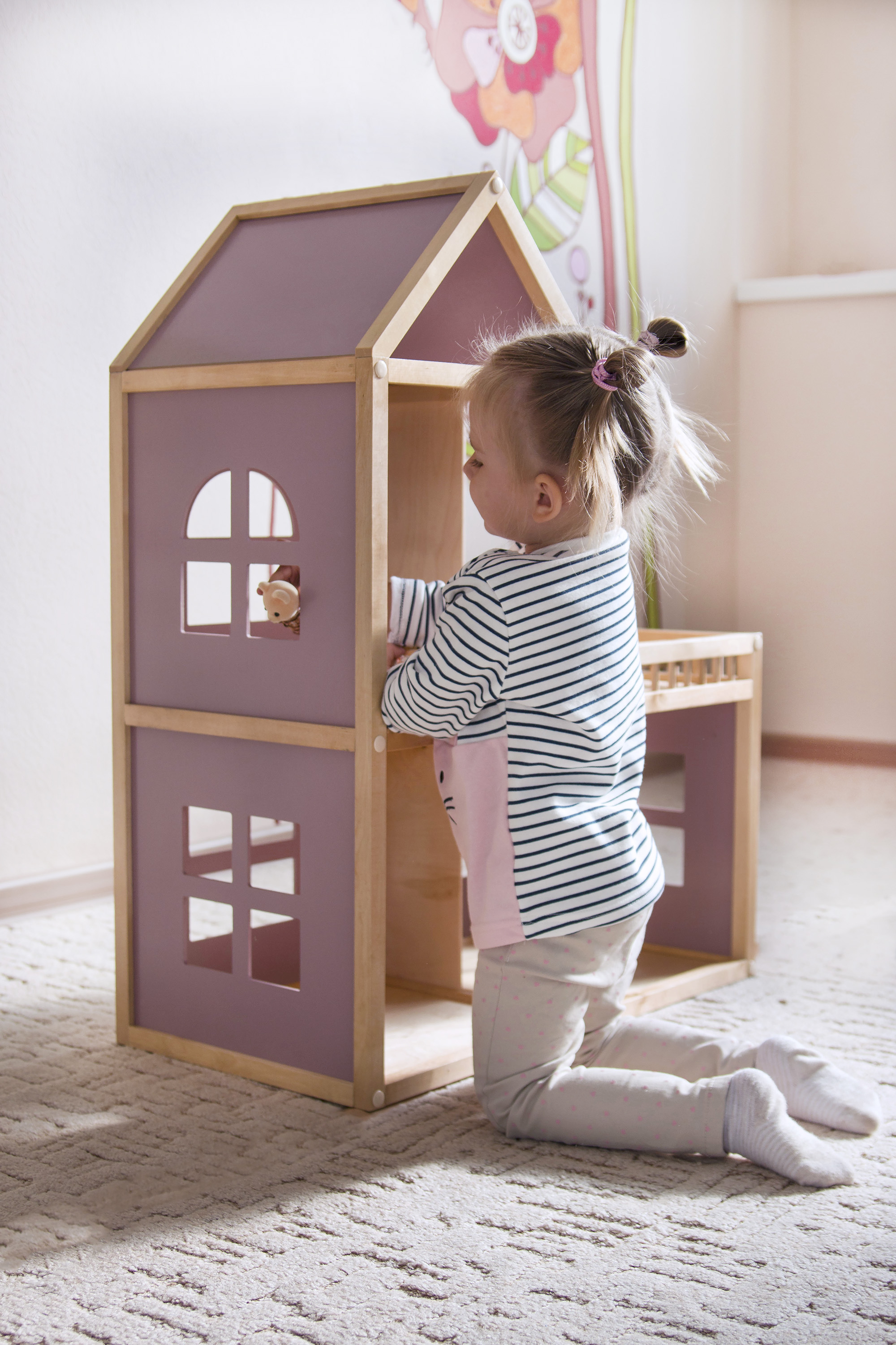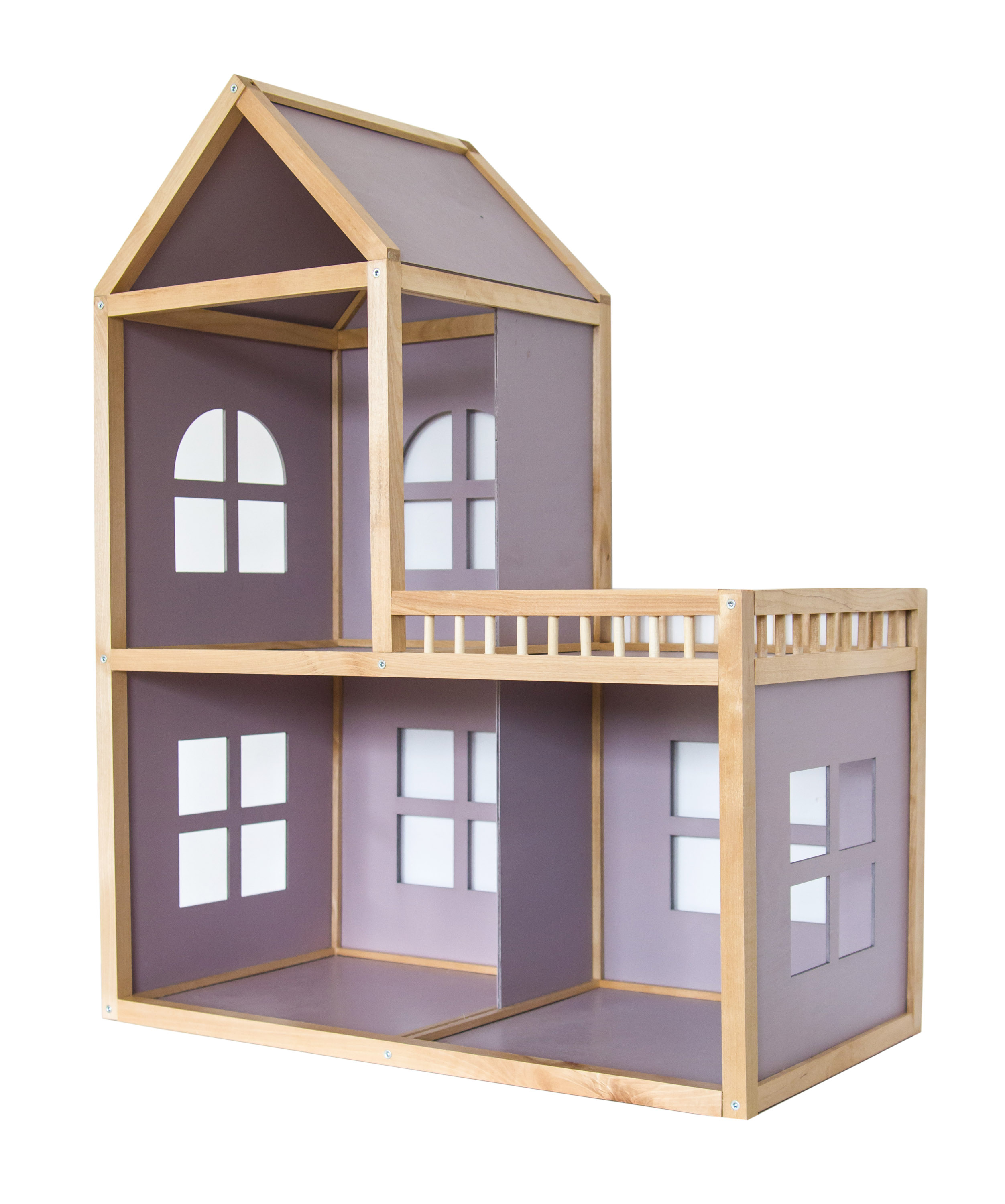 Трехэтажный домик подойдет для игр с куклами высотой до 30 см. Выполнен в сиреневых тонах. Состоит из трех комнат, террасы и чердака. Детали крепятся друг к другу на евровинты, которые входят в комплект. Передние стенки можно двигать во время игры.