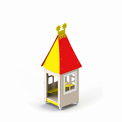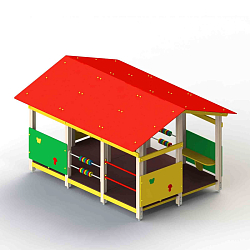 Уличный домик оснащен угловыми сиденьями, скамейкой, окном и подоконником, входной аркой, проемом между ограждениями, фигурными столиками на стойках, d 42 мм. Пол сделан из фанеры. Низ 2-скатной крыши волнообразный.