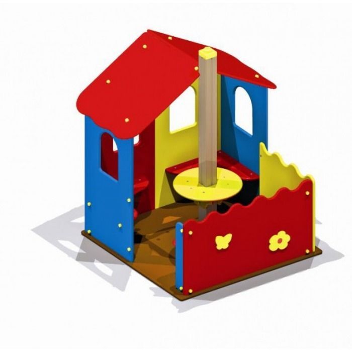 Опорный столб из клееного бруса бетонируется в землю, вокруг центральной оси закрепляется столешница. Пол выполняется из нескользящей фанеры. На стенах закрепляется угловое сиденье. Домик прикрывается скатами влагостойкой фанерной крыши. Ограждения палисадника с волнообразными верхними краями дополняются декором в виде цветочков и бабочек.