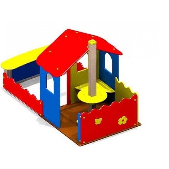 Опорный столб с металлическим подпятником бетонируется в землю, вокруг центральной оси закрепляется столешница.  Пол выполняется из нескользящей фанеры, домик прикрывается скатами влагостойкой крыши. Между стенами закрепляется угловое сиденье. Ограждения палисадника с волнообразными верхними краями дополняются декором в виде цветочков и бабочек. Песочница состоит из столика, бортика и ограждений, которые опираются на столбы.